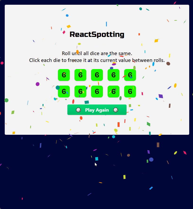 Reactspotting is a Dice Game web applicatio that challenges users to roll ten dice until all of them match, incorporating features such as state management, conditional rendering, and event handling. It provides a fun and hands-on way to explore lazy state initialization and showcases the use of advanced concepts like `useEffect` for tracking component updates. The game is developed using React functional components, with each die rendered dynamically and managed through a central state. The use of Vite to update and streamline the development environment ensures that the application is not only efficient but also reflects modern web development practices. By building the game from scratch, the project highlights an understanding of component reusability and state-based rendering to create an intuitive user experience. In addition to being a demonstration of React’s capabilities, this project exemplifies the process of optimizing user interaction by introducing features such as locking dice values and displaying celebratory animations upon winning. The incorporation of tools like `nanoid` for unique IDs and the use of a `Confetti` component upon winning further demonstrate creativity and a commitment to user engagement.